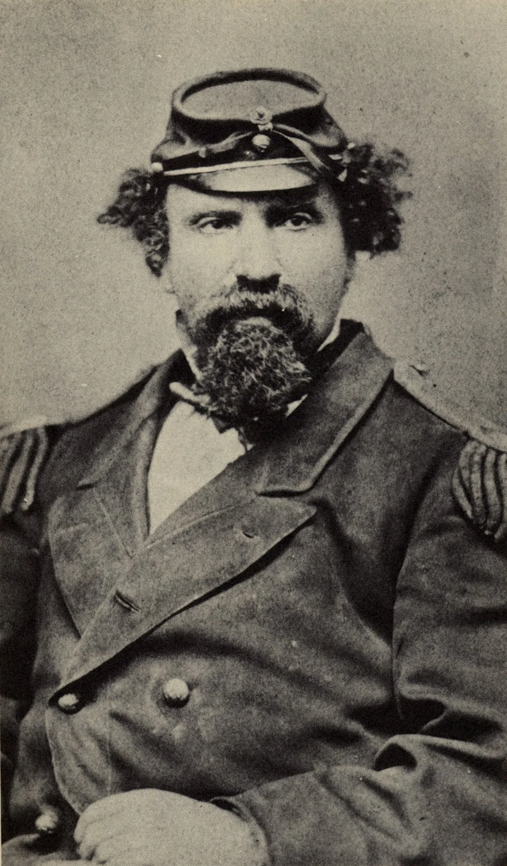 The beard worn by this gentleman, too, reflects the “tonsorial experimentation” among men — my phrase — that didn’t really arrive until the Civil War. Below is an 1861 photograph featuring then-Colonel Ambrose Burnside (1824–1881), wearing his trademark “friendly muttonchops” beard, in which bushy sidewhiskers — later called “sideburns,” in tribute to Burnside — were joined by a moustache.