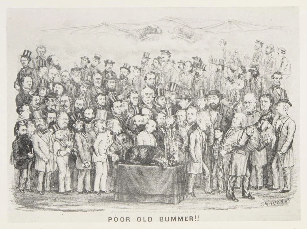 THE FOLLOWING YEAR, 1865, Baker — using the nom d’art “Snooks, Jr.” — featured Emperor Norton once again in his cartoon “Poor Old Bummer!!” The cartoon memorializes the death of the remaining half of the famous San Francisco canine duo of Bummer and Lazarus. Lazarus had died in 1863.