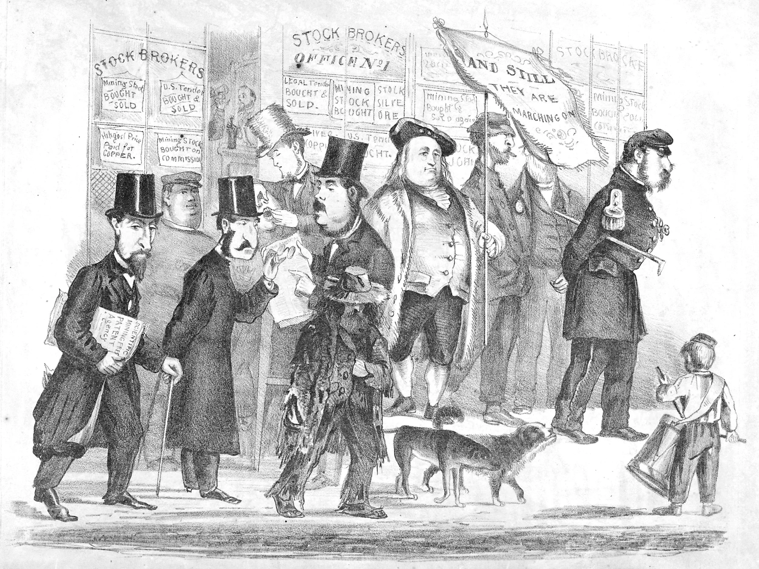 Montgomery Street scene featuring Emperor Norton; Bummer and Lazarus; and George Washington II (later titled Stock Brokers; And Still They Are Marching On), 1863 (possibly between February and September 1863), by Edward Jump (1832–1883). Collection of the Bancroft Library at UC Berkeley. Source: Calisphere