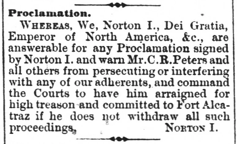 Proclamation of Emperor Norton, Oakland Tribune, 31 May 1875, p. 3. Source: California Digital Newspaper Collection