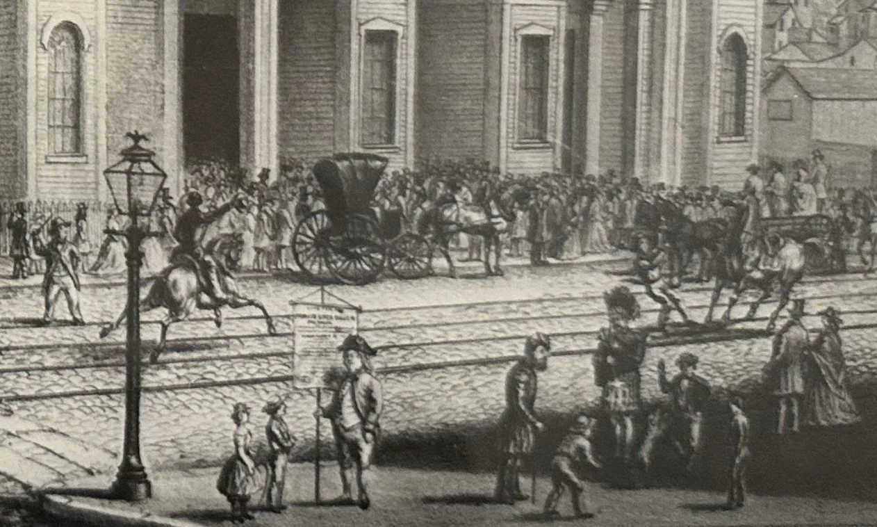 The focus of this engraving is the first pavilion of the Mechanics’ Institute, built in 1857 and located on Montgomery Street between Post and Sutter.